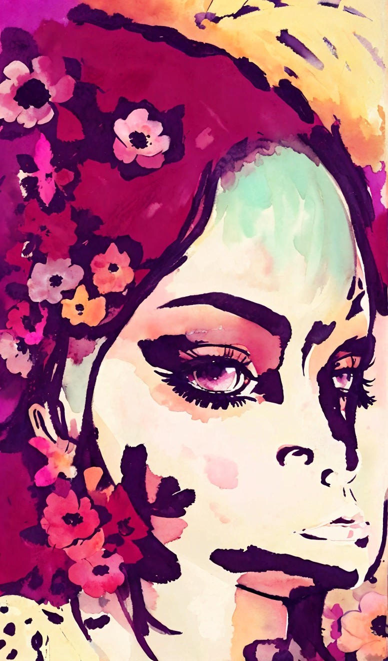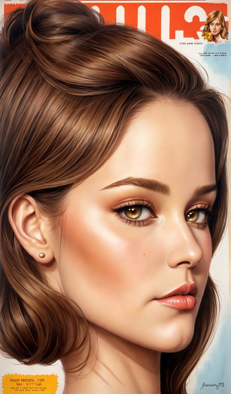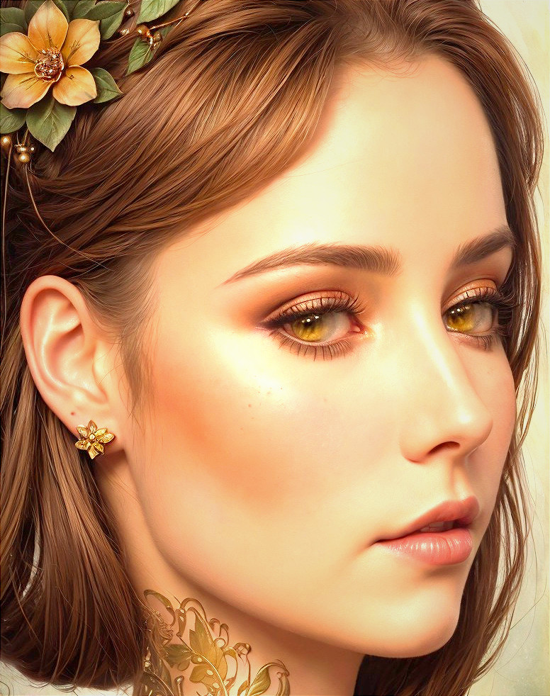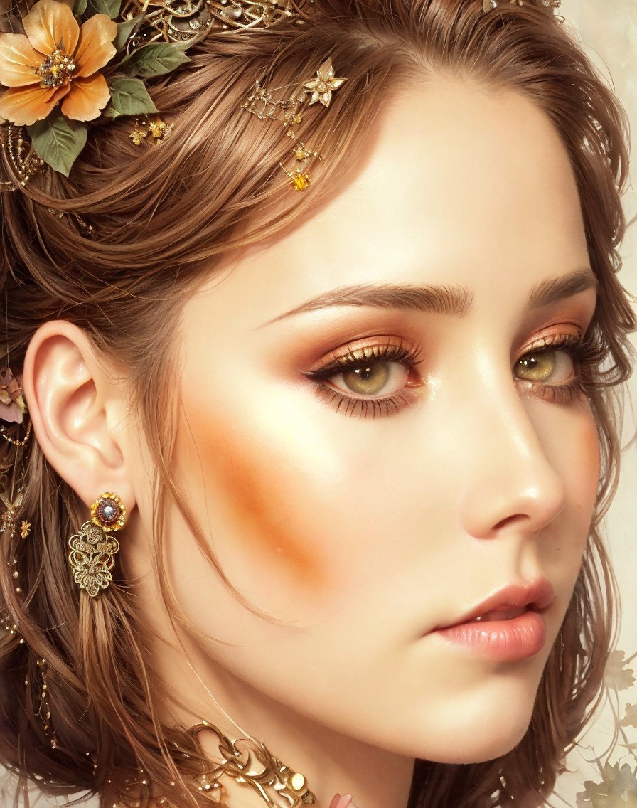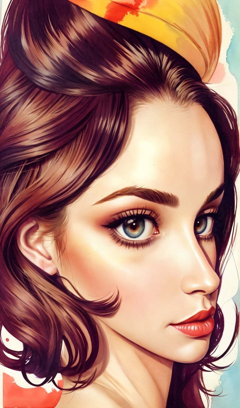 Prompt: Portrait of gorgeous female with brownish hairdo, Decorated and adorned Temptress portrayed in watercolor and ink, gazing upwards with a sense of prudence and nostalgia, clockpunk, american style of Art nouveau, moody ,eerie, eldritch, eyes looking at viewer, devilish eyes 1.7, muted colors 0.7. Use shades of beige and black and marigold. 3d effects 1.8 in style of Overton Loyd, triadic color scheme brown beige auburn, dark fantasy art, highly detailed retrofuturistic features, ambient occlusion 1.5, octane render, brightness, 1.7, plasticity 1.6, complexion 1.4, radiance, illustrative maximalism, highlighted reflections, vector 9:5, shadow mapping. 2.7, dynamic lighting 1.7 amber rim lighting 1.7, colorful reflections, highlighted reflections, scruffy psychedelic psychpomp scene, crackles, detailed hairdo, blurry aura, fantasy movie still, synthetic essence, wavery texture 1.8,ochre tines, hues, mist, grain,raytraced shadows 1.8, sublime, brightness 1.4, tints of comic book art, detailed ornamental features of atompunk, streamline_moderne, anisotropic filtering 1.7 ,hues, grain, Schreger lines, luminous iridescence,