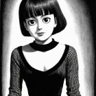 The image features a stylized, monochrome illustration of a woman with a sleek bob hairstyle, wearing a form-fitting black outfit with sheer striped sleeves, exuding a mysterious allure.