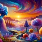 A woman in a flowing blue dress stands on a winding path, surrounded by vibrant purple trees. A swirling, colorful sky fills the backdrop as the sun sets behind majestic mountains.