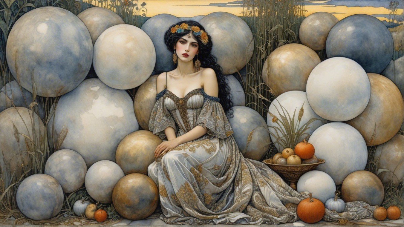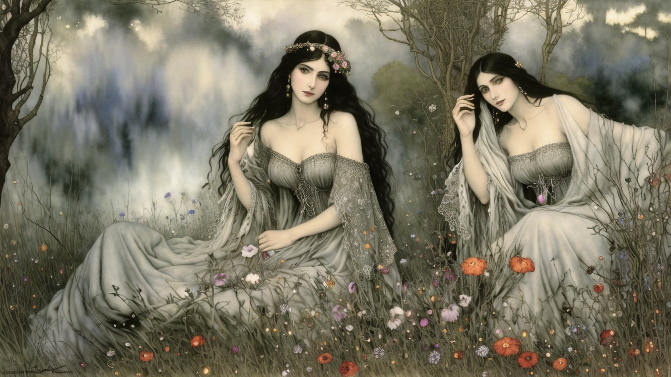 Two elegant women sit by a serene riverbank, adorned in flowing dresses with floral accents. Surrounding them are lush landscapes, enhancing the enchanting, mystical atmosphere.