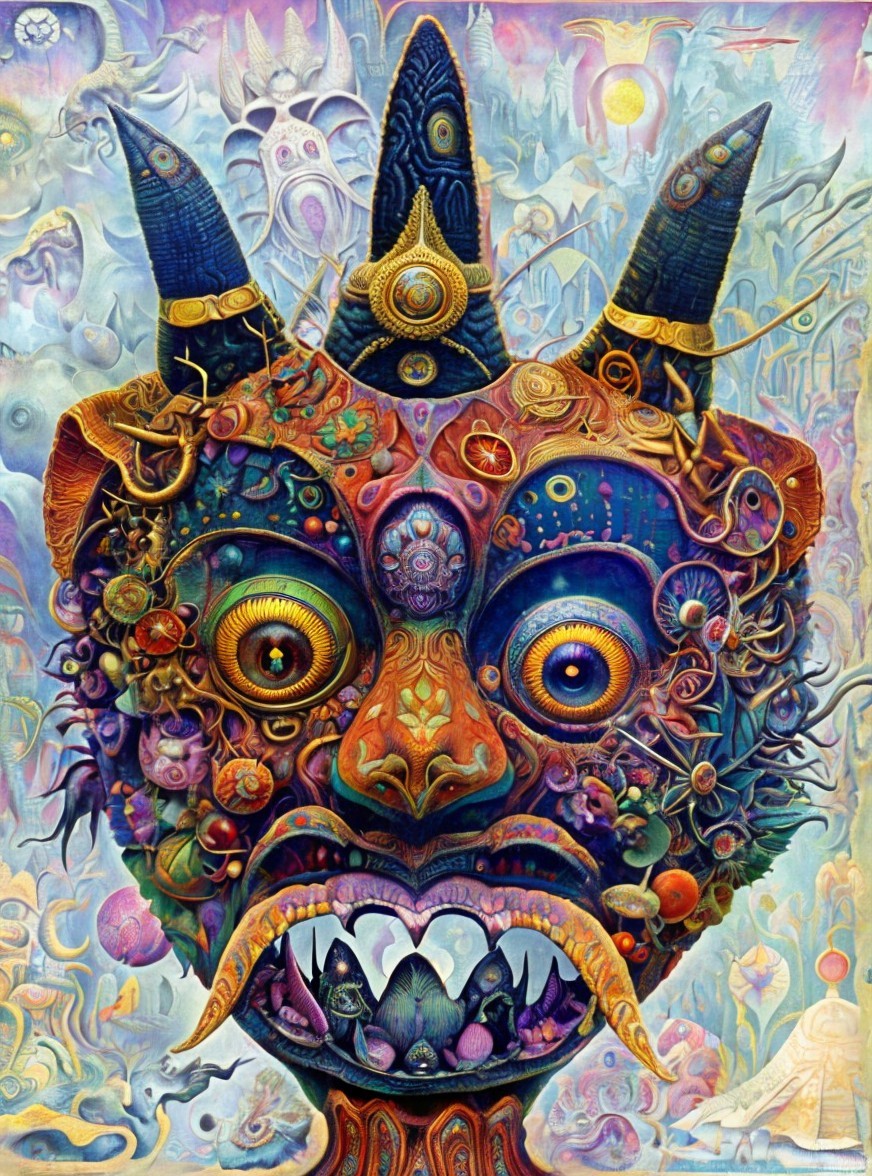 A vibrant, psychedelic painting of a fantastical creature with elaborate textures, golden eyes, ornate decorations, and horns against a detailed background.