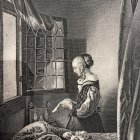 A young woman stands by a window, reading a book in a warmly lit, rustic room adorned with autumn colors. Fruits are arranged on a table, enhancing the cozy atmosphere.