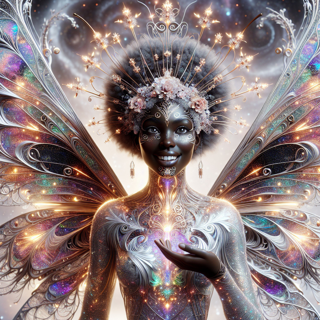 A radiant figure with intricate, shimmering wings stands gracefully. Adorned with floral elements and glowing patterns, she exudes a magical aura, embodying beauty and transformation.