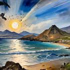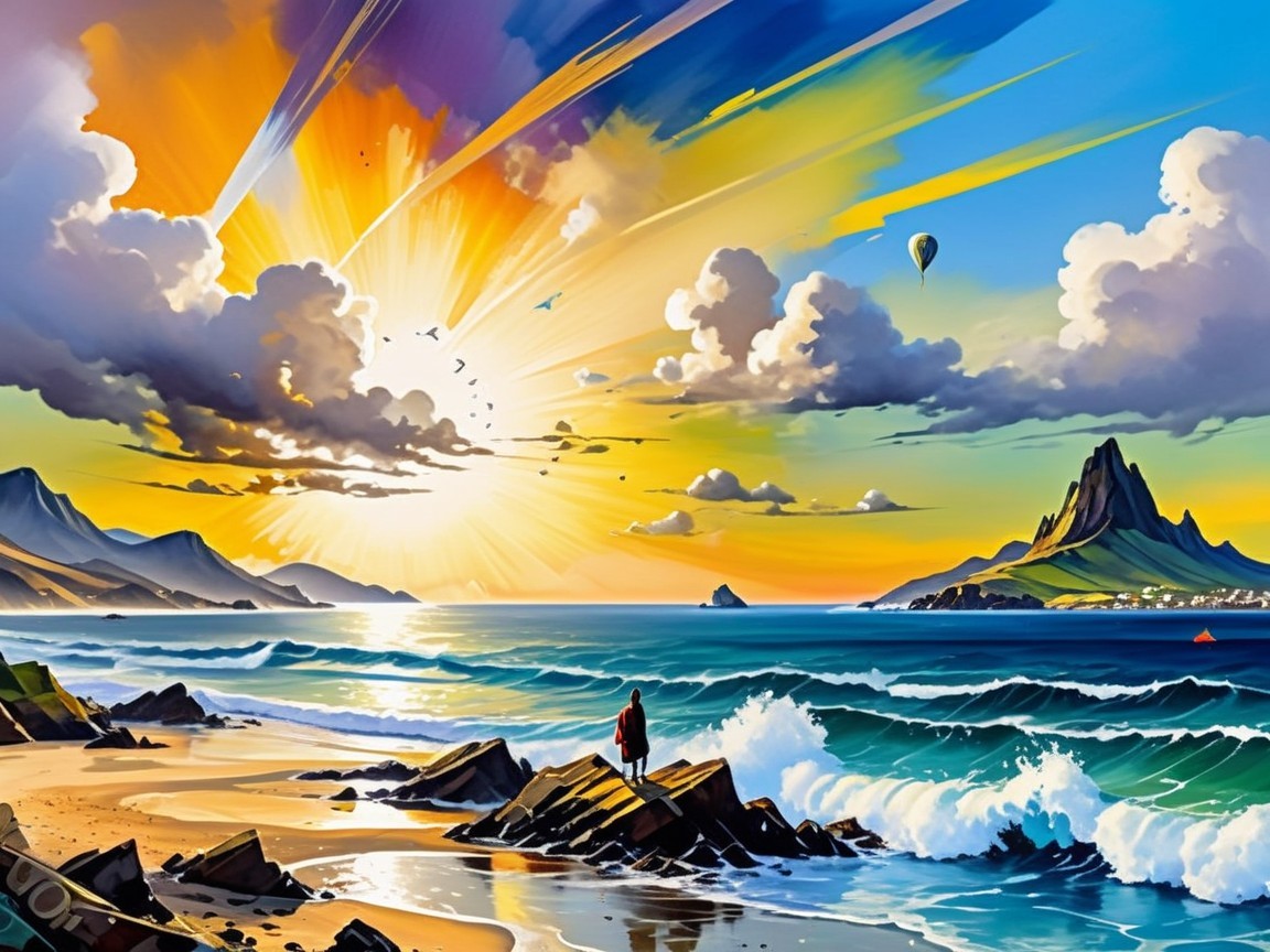 A vibrant beach scene at sunrise, featuring dramatic clouds and waves crashing against rocky shores. A lone figure stands gazing at the colorful horizon, with distant mountains and a hot air balloon.