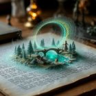 A serene miniature landscape emerges from an open book, featuring a tranquil pond, lush trees, and a whimsical bridge. A figure stands by the water, surrounded by ethereal glowing mist.
