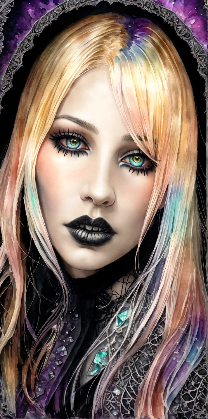 + Prompt:detailed and intricate watercolor and ink portraiture, scruffy gothic rock woman with crystalline iridescent hair, dark and creepy style reminiscent of renowned artists. High coloring 1.9, filigree details, Zentangle line artwirk, 3d effects 1.8, anisotropic filtering 1.2, raytraced shadows 1.8, sublime, mood, eroticism, seductive, plasticity 1.6, illustrative maximalism, highlighted reflections, psychedelic psychpomp, porcelain burst, golden ratio, tints of 1970s advertising art, joyful, inviting, american gothic 1.7, dimmed lighting 1.7, ambient occlusion 1.5 with a dark and composed atmosphere. Style of Margaret Keane and Overton Loyd, triadic color scheme pink blue grey, bioluminescent eyes, Soft rounded edges, crisp quality, vector 9:5, hues, inkpunk 1.8, instaport style 1.6,