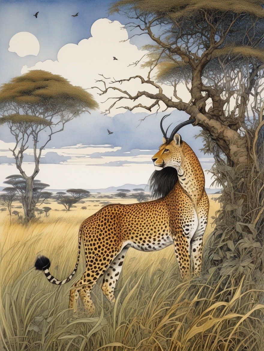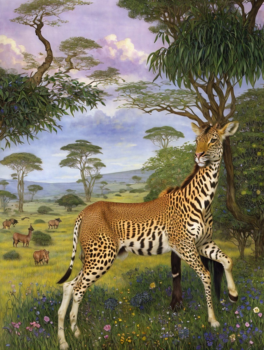 A serene woman in an elegant dress stands by a tree, overlooking a savannah with zebras under a clear sky.