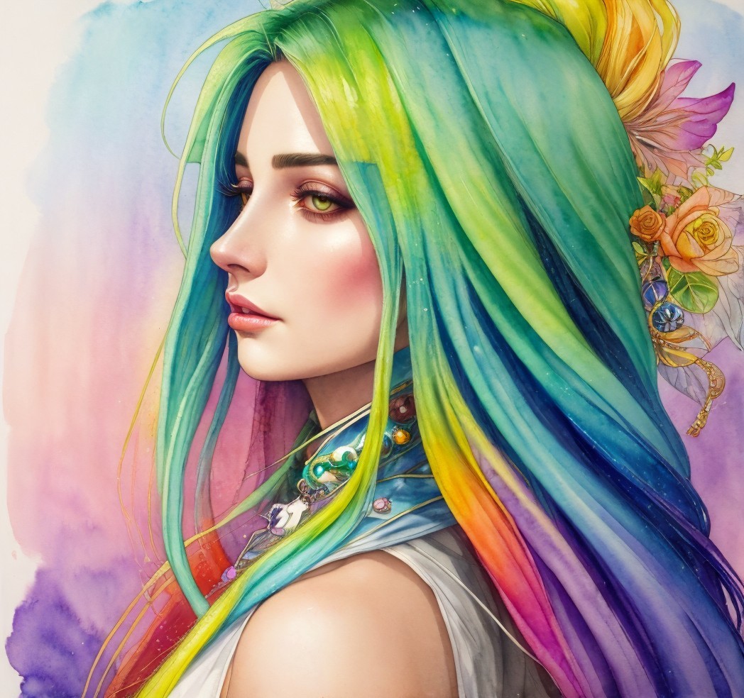 Watercolor and ink illustration, Beautiful headshot with aura, Handsome priestess with green dreadlocks, illustrative style by Micheal cheval, Arlie Opal, Overton Loyd, Frank Miller, Georgia O'Keeffe, Charles Rennie Mackintosh, Margaret Keane, tints of neon art, side view, mosaic, hues, encaustic texture, gradient inking colors, beautiful, dreamscape, decoupage, crisp, octane render illustration 1.5, tints of comic book art 1.7, grunge, american gothic 1.5, curly green hairdo, ink splashes 1.9, triadic color scheme pink green lilac, Figurative Art, epic, complex filigree, inkpunk 1.8, tints of 1970s advertising art, 3d effects 1.8, shadow mapping 1.3, dynamic lighting 1.7, sift rounded edges, ambient occlusion 1.5, tints of psychpomp, anisotropic filtering 1.7, dimmed dynamic lighting, brushstroke fields beautiful composition,