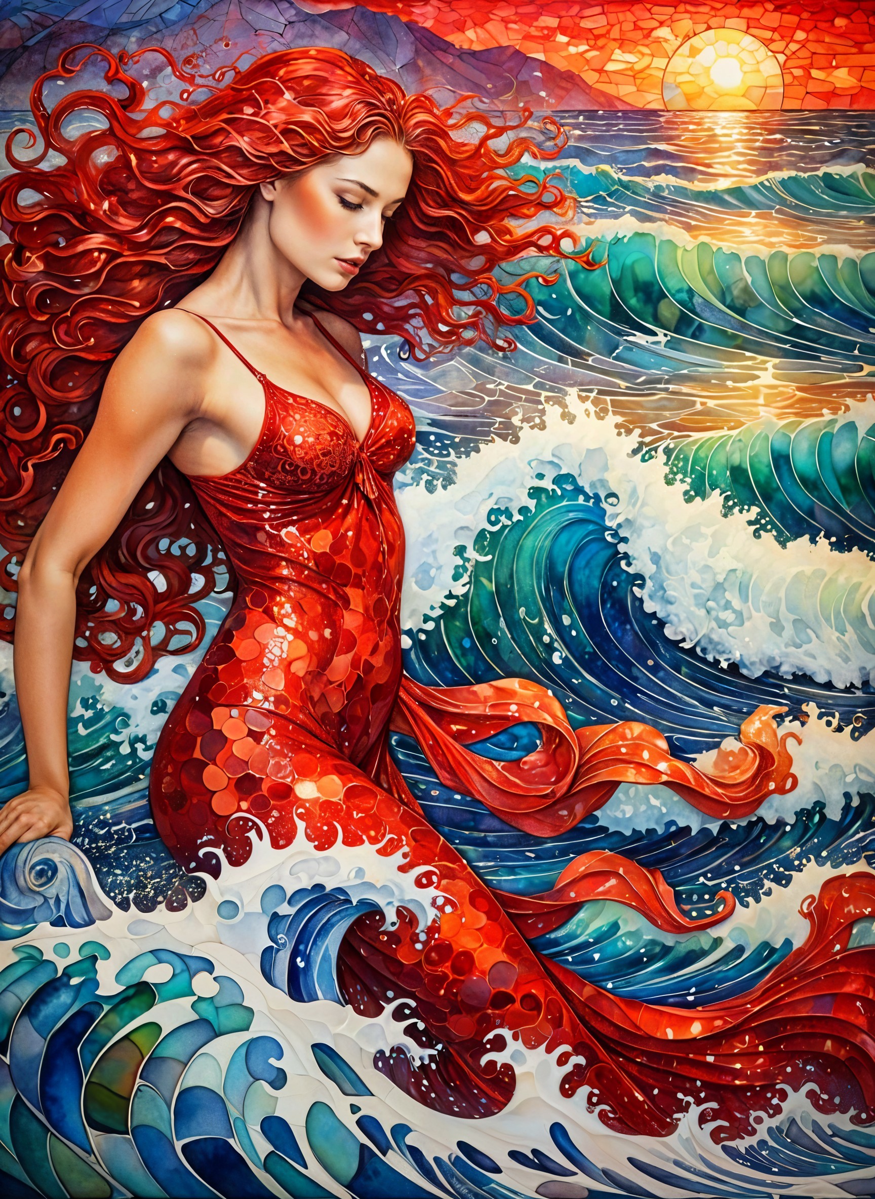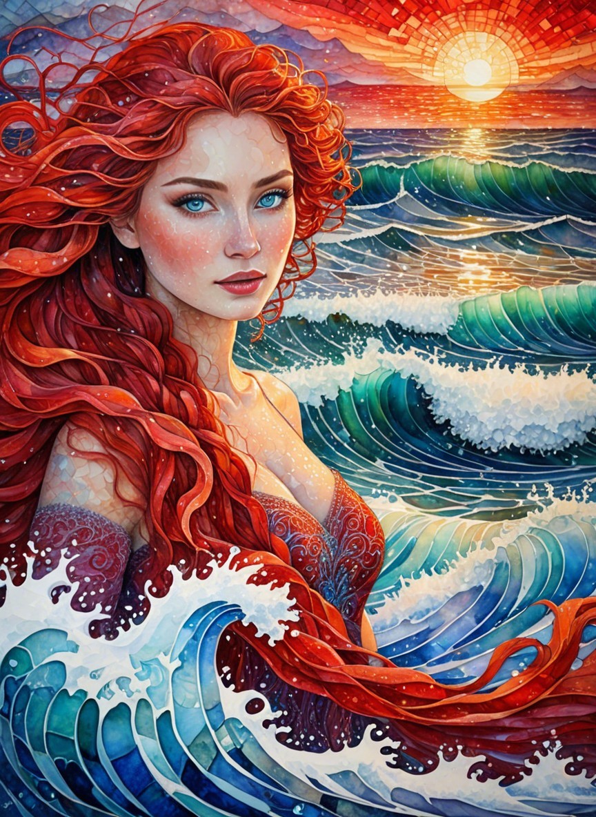 A vibrant mosaic depicts a mermaid with flowing red hair, nestled among crashing waves. The sunset casts warm hues over the ocean, creating a magical, serene atmosphere.
