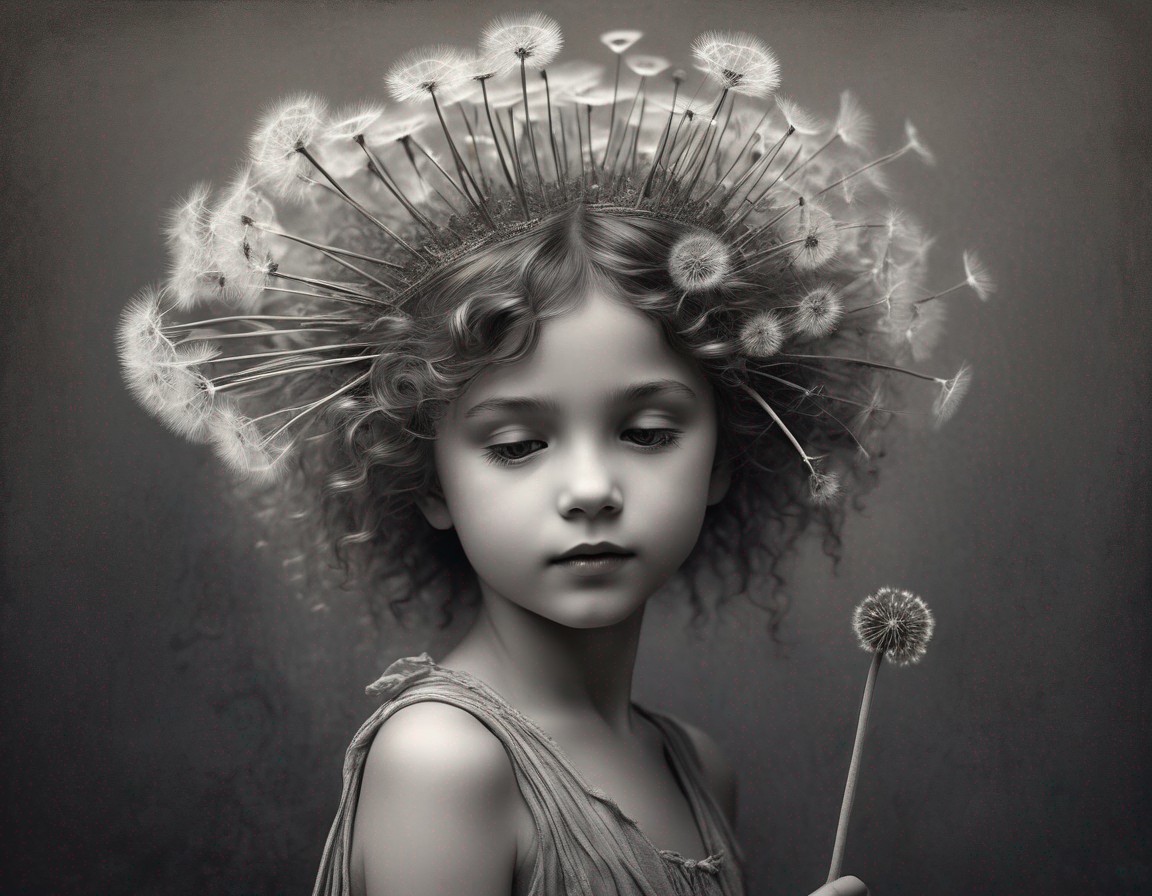 A digital painting of a girl with a halo of dandelion seeds and flowers in her flowing hair, giving her an ethereal look.