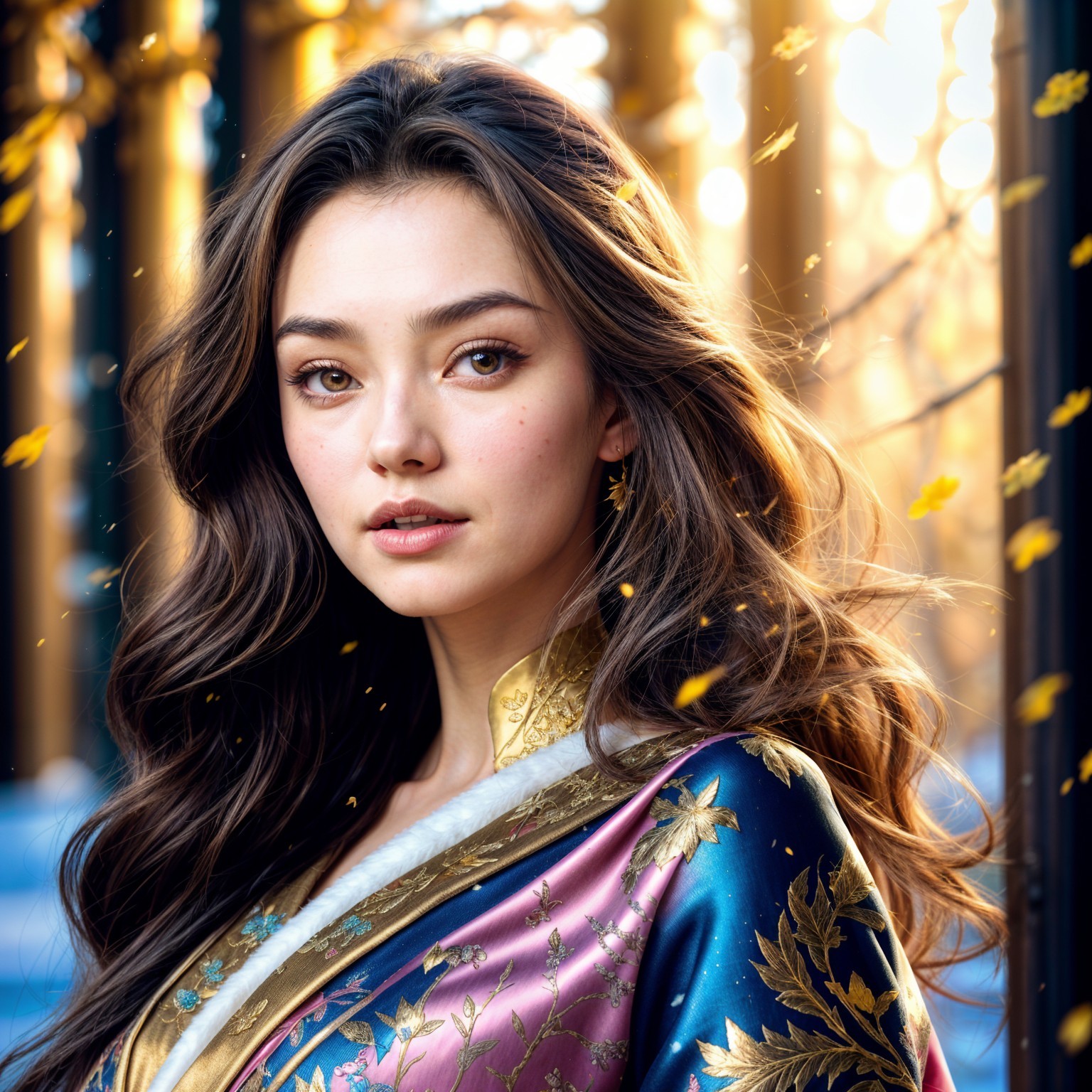 A young woman in a colorful kimono stands gracefully, holding a decorative umbrella. Her hair is adorned with flowers, and soft petals drift around her, creating a serene, enchanting atmosphere.