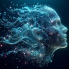 A serene face in profile, illuminated with ethereal, flowing hair. The background is deep blue, with sparkles resembling stars, creating a dreamy, otherworldly atmosphere.