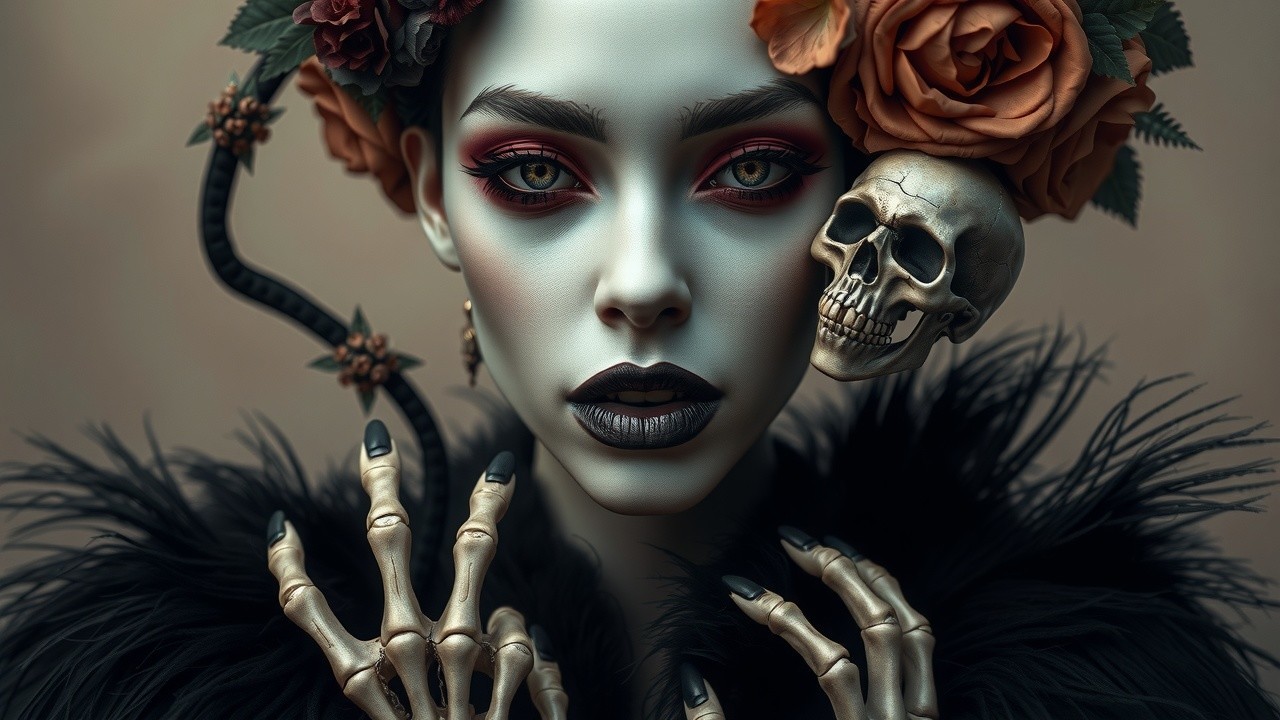 A striking figure with pale skin and dark makeup, adorned with a floral crown and a skull. The dramatic contrast of colors and textures creates a haunting yet beautiful aura.