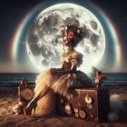 A glamorous woman in a wheelchair poses on a beach, wearing a white dress adorned with flowers. A large colorful beach ball and pastel-colored spheres set a vibrant, whimsical scene at sunset.