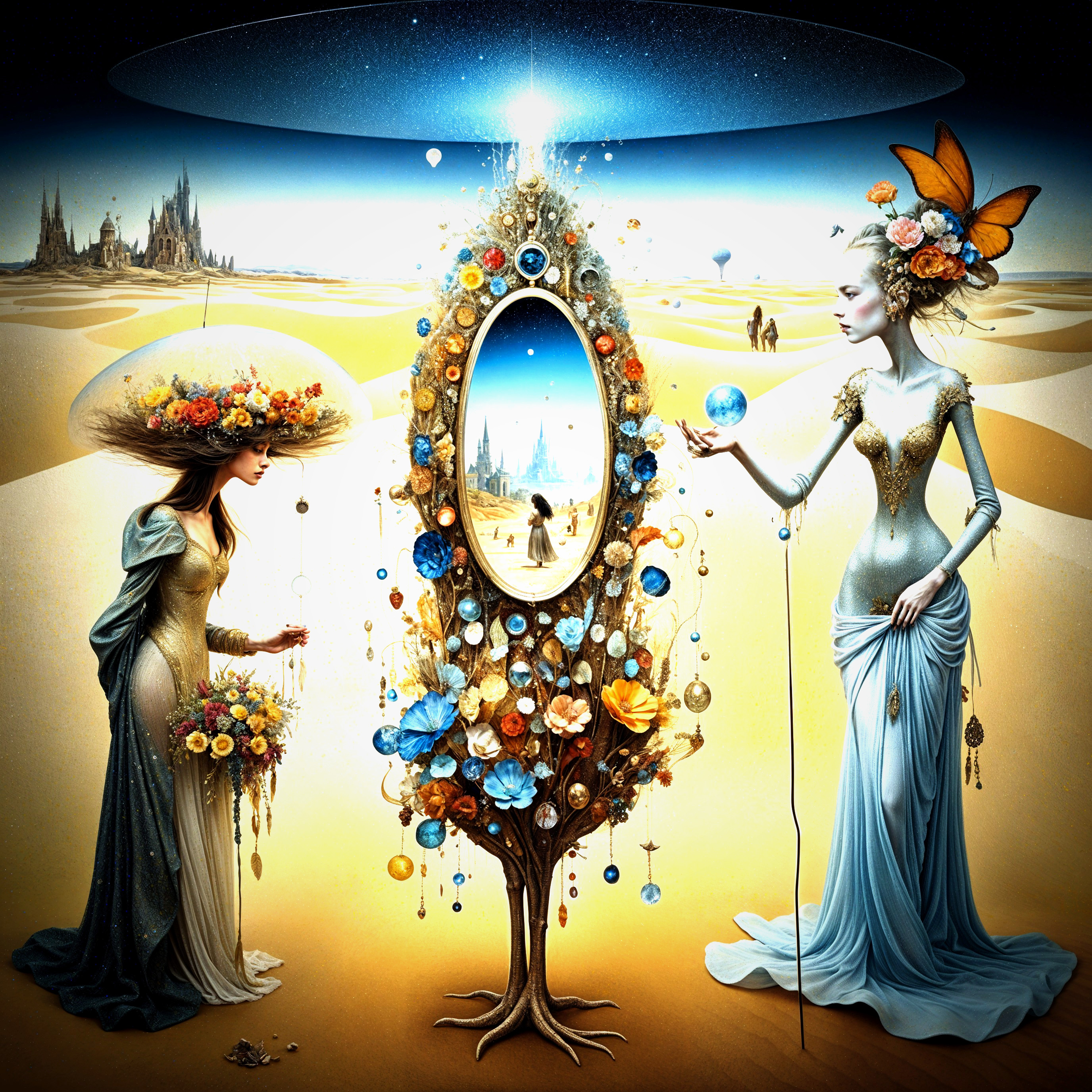 A surreal scene featuring two elegant figures: one adorned with flowers and the other in a flowing gown, standing beside a tree-like mirror amidst a dreamy landscape. Vivid colors and whimsical elements abound.