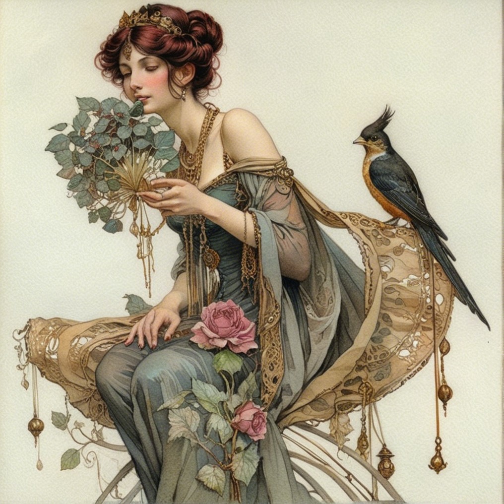 A beautifully styled woman in an elegant gown holds a fan while sitting gracefully, accompanied by a colorful bird. The scene is adorned with delicate flowers, exuding a sense of elegance.