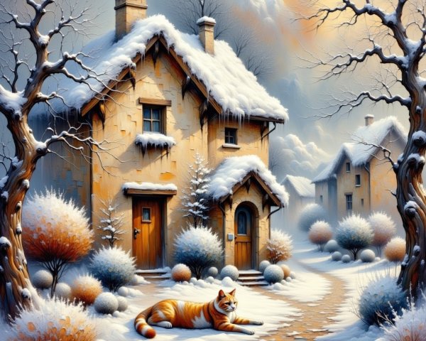 A charming winter scene features a snowy village lit by warm lights. A beautifully decorated Christmas tree stands in the foreground, with festive buildings and stars overhead.