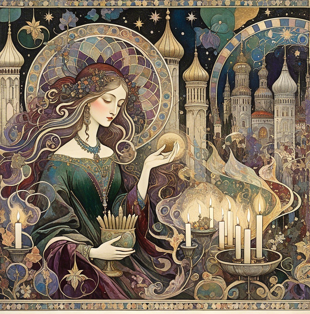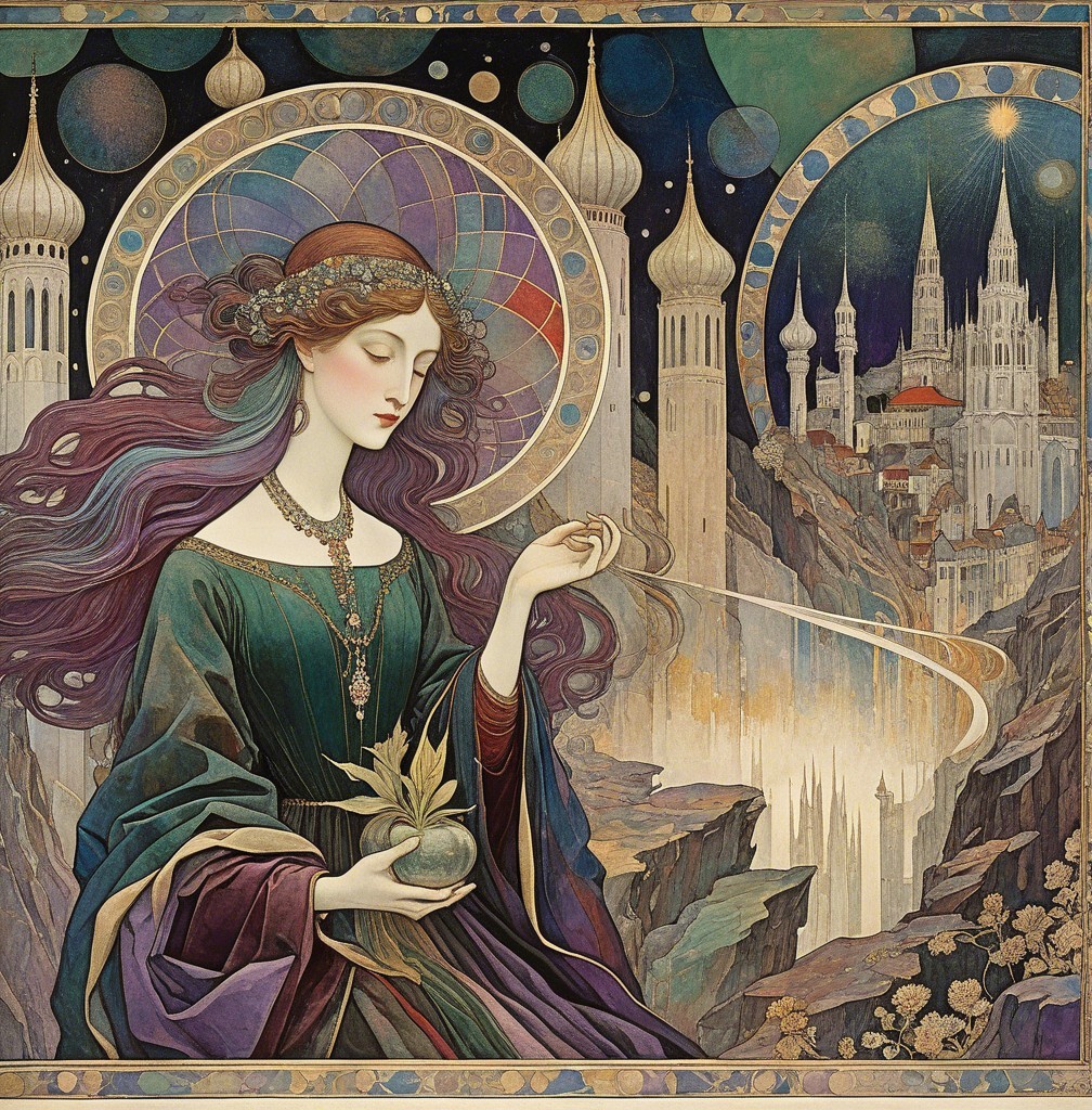 one full width color image, marbled portrait, style of Mikalojus Ciurlionis, style of Umberto Boccioni, style of Harry Clarke, 侘び寂び, flowing hints of silver blue green purple red gold deep mauve