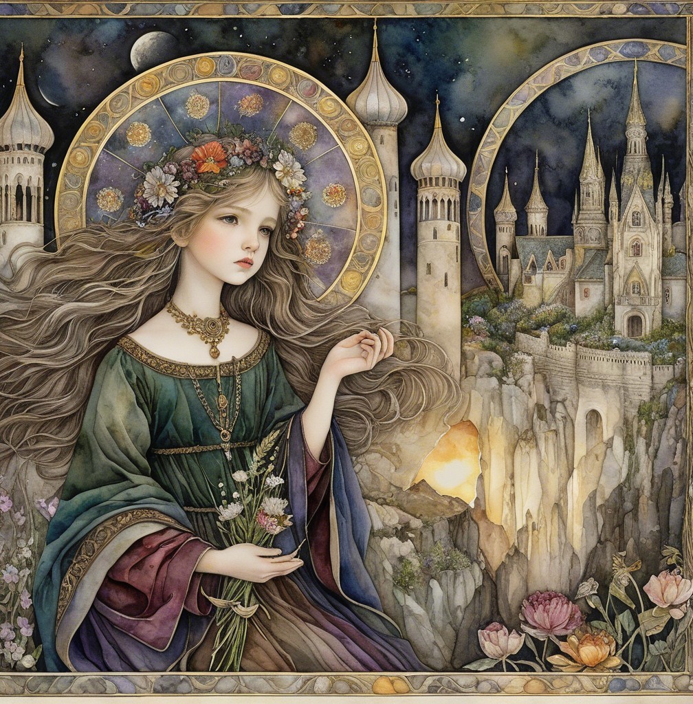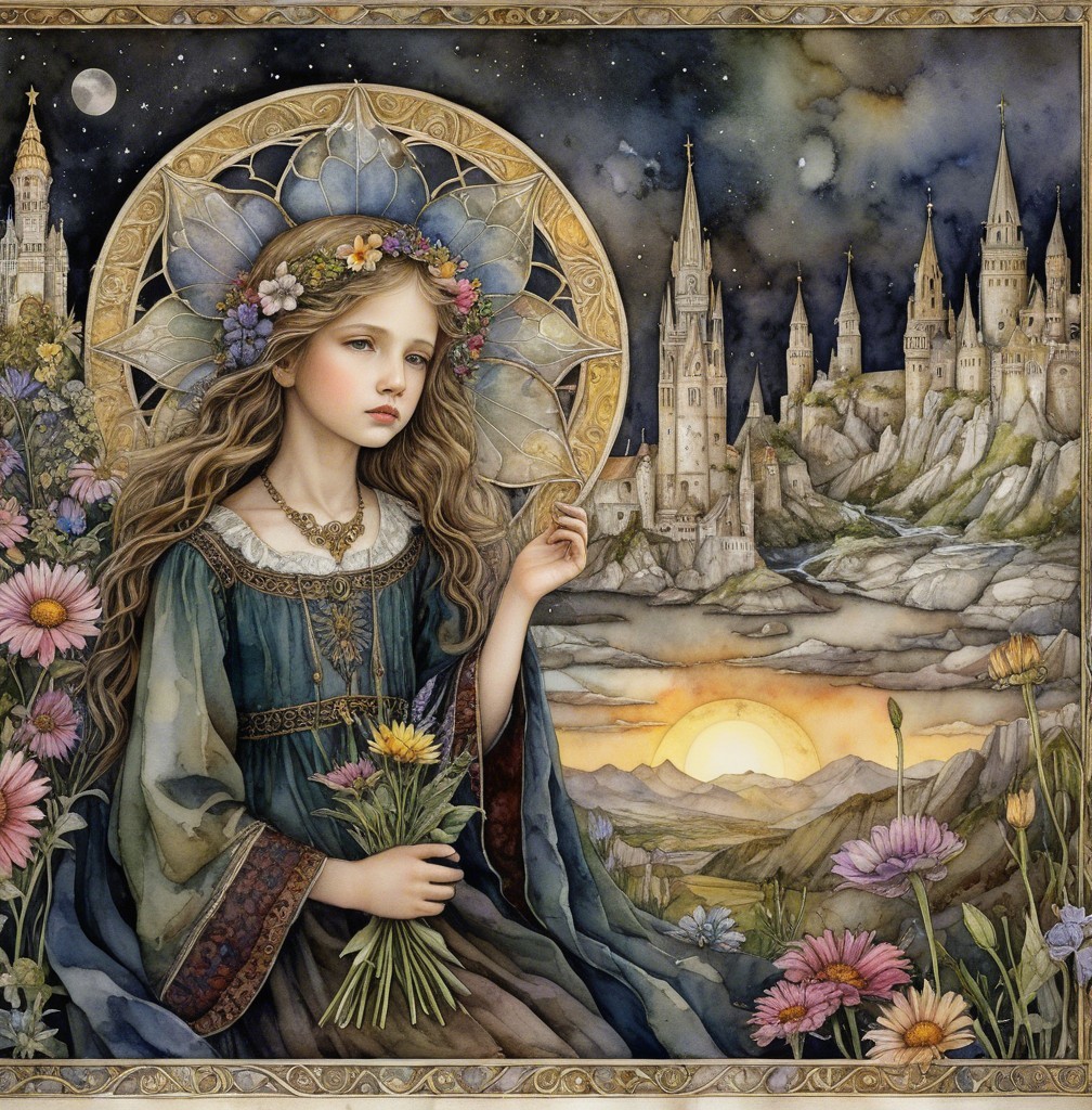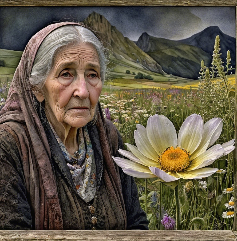 Wild Sad flower old lady . colored ink drawing, watercolor artwork on old withered paper, vintage, by Caravaggio, Fragonard, Anton Pieck, pale colors, high detail, intricately detailed, hyperdetailed volumetric lighting, art nouveau graphic steampunk ., whimsical, beautiful, poignant, touching. colors blush bronze, black. soft watercolor extra water in magical realism by Annigoni, Egon Schiele, Milo Manara, Botticelli, Catrin Welz-Stein, Jean Metzinger, Klimt, perfect eyes, perfect handsface, highly detailed, complementary colors, hyper detailed. Watercolor and ink splatter, dynamic pose, dark blue background, unreal engine, alphonse mucha, global illumination, detailed and intricate environment Beautiful woman in the style of Pino Daeni Dorota Piotrowiak Edward Gorey, junji ito, klimnt , gold leaf color, silver leaf color beautiful dynamic lighting high definition hdr * Random prompt award winning Max Ernst ultra detailed 4K 3D Texture