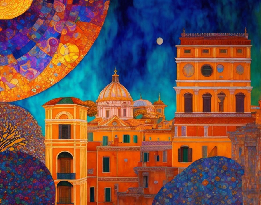 A vibrant, stylized painting of Italian-style buildings under a starry, mosaic-like sky with a full moon.