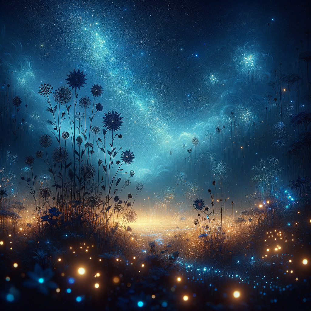 A starry night sky over a blooming meadow with fireflies and a distant glowing horizon under a mix of clouds.