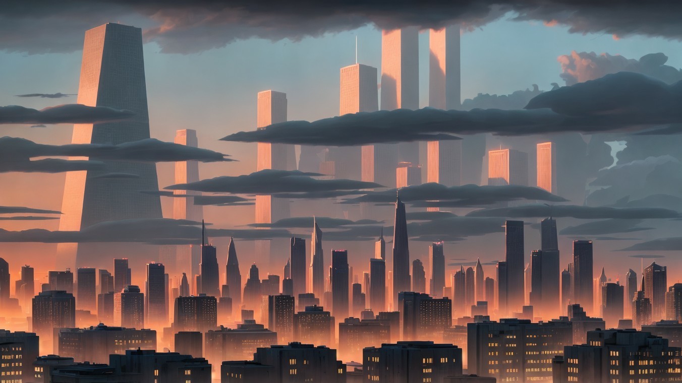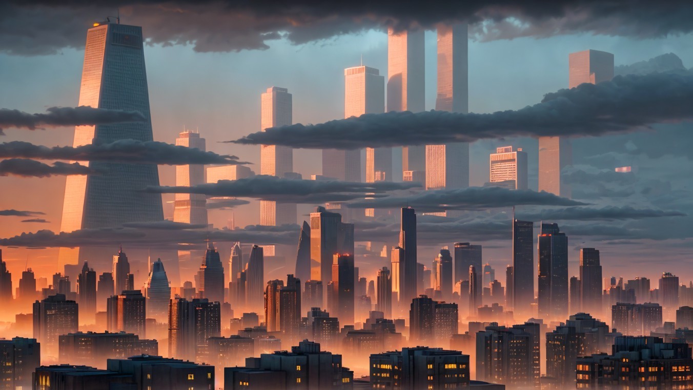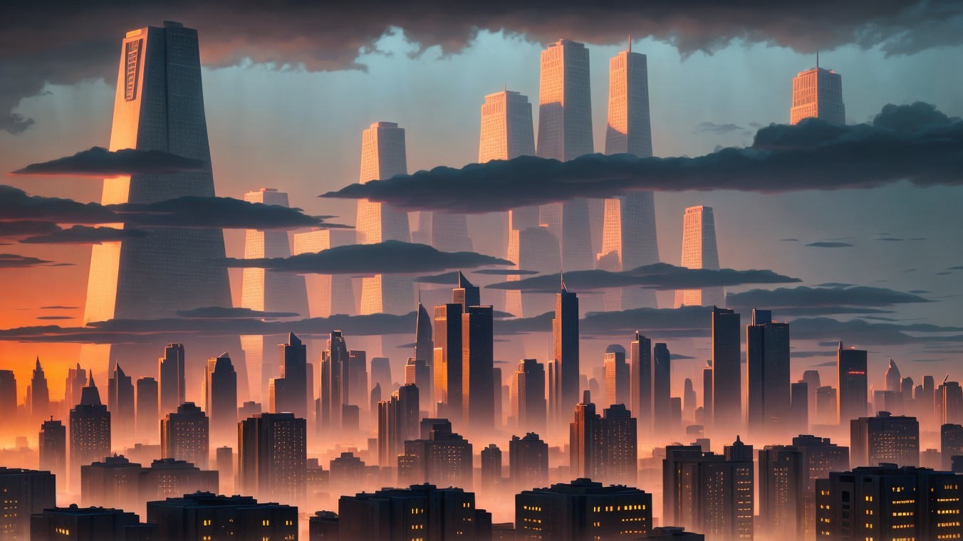Dystopian Cityscape at Sunset with Skyscrapers and Smoke