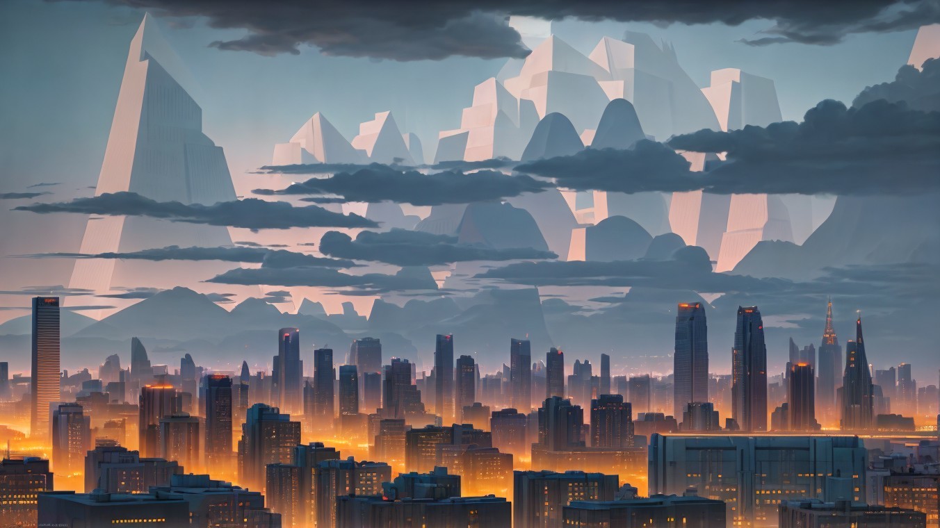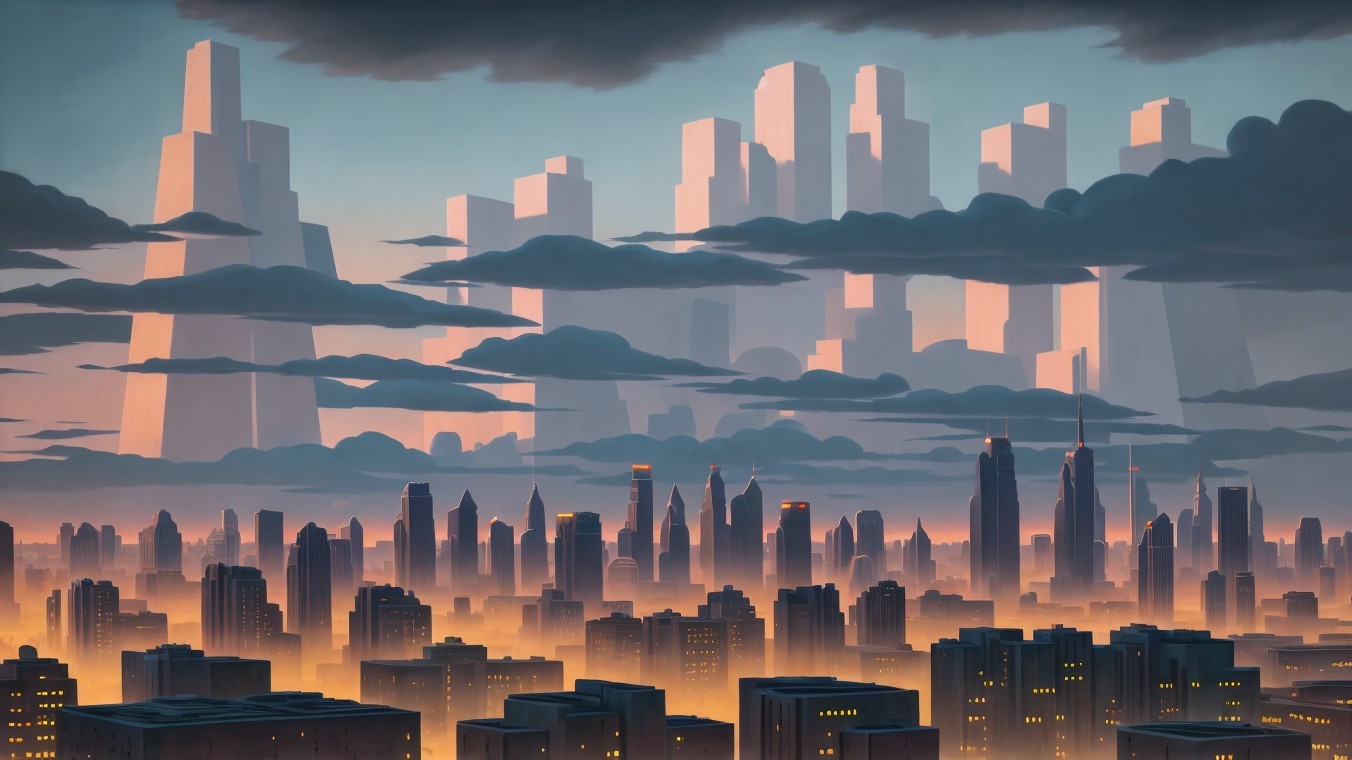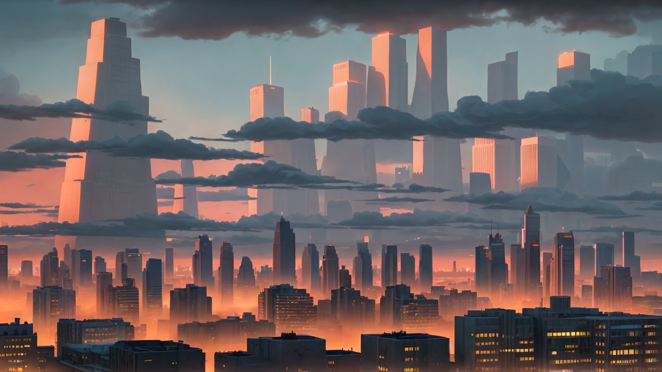 Dystopian Cityscape at Sunset with Skyscrapers and Smoke