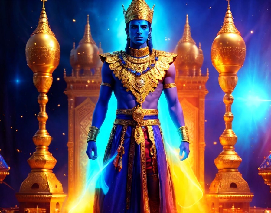 A digital artwork of a blue-skinned deity in golden attire surrounded by mystical blue flames and ornate golden lamps.