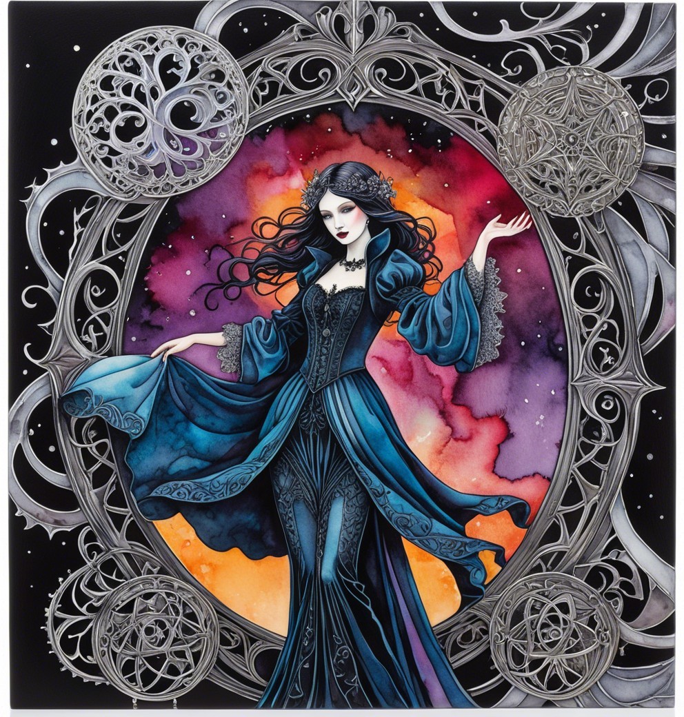 + Prompt:A whimsical watercolor and ink painting emerges, featuring tiny outlines that intricately define a Gothic maiden with an Eldritch twist. The artwork, reminiscent of woodcut-inspired graphics, showcases surreal fissured hues in a plique-à-jour technique. Metallic silver fractal effects dance across the composition, intertwining with dye hues and dappled lighting. The impressionistic style is layered with luminous jewel colors meticulously detailed, as intricate linework patchwork merges with tessellated plasticity. The piece exudes a luminism that hints at Baroque influences, with Ernst Haeckel's color palette and mandelbrot aesthetics shining through.