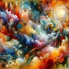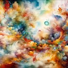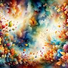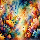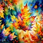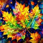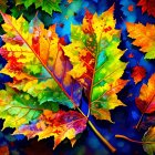 A vibrant array of autumn leaves in a mix of fiery reds, oranges, and bright greens, set against a deep blue background, creating a lively and colorful seasonal display.