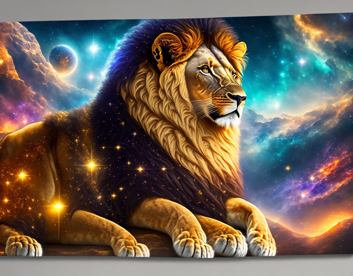 A majestic, cosmic lion with a starry mane against a vibrant nebula backdrop.