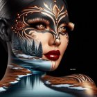 A close-up portrait of a striking woman with bold, shimmering turquoise and gold makeup. Her glossy lips and intricate facial designs create a captivating, artistic effect against a blurred background.