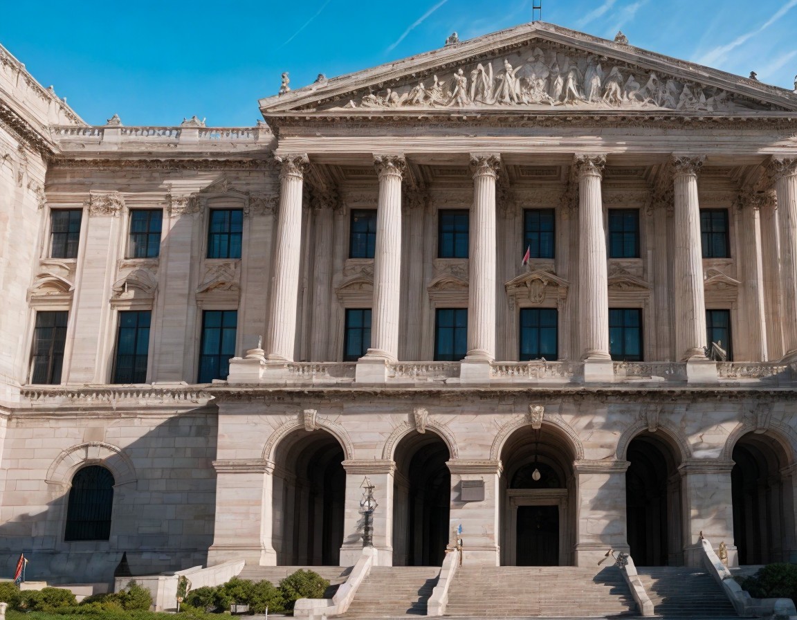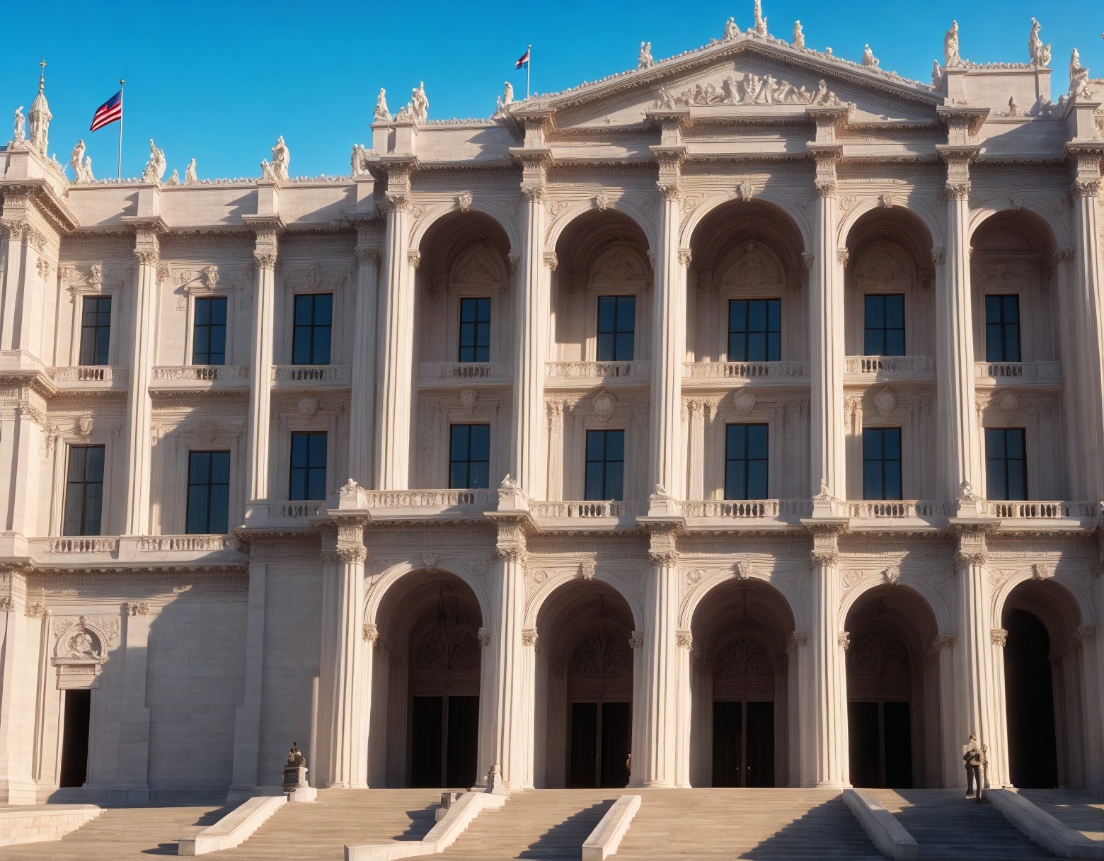 A stately classical building with ornate details, arches, and columns, beneath a clear blue sky.