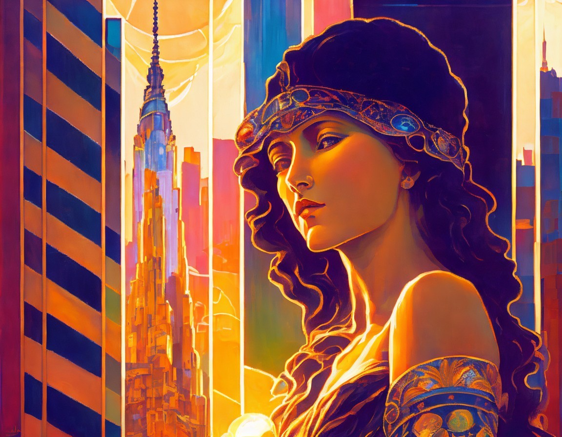 A vibrant, stylized portrait of a woman with flowing hair, adorned with ornate jewelry, set against a backdrop of a sunlit cityscape featuring the iconic Chrysler Building.