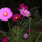 A vibrant painting featuring pink and red flowers against a dark background. The blossoms stand tall among rich green leaves, with subtle hints of raindrops adding a sense of freshness.