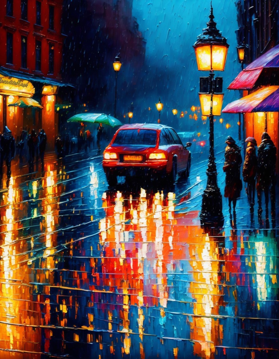A vibrant, rainy street scene at dusk, featuring glowing street lamps and reflections on wet pavement. People walk under umbrellas, while a car drives through the illuminated urban landscape.