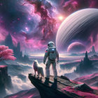 Astronaut and Dog Overlook Vibrant Alien Landscape