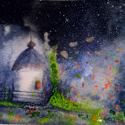 A vibrant, dreamlike landscape features a small, illuminated church amid swirling cosmic colors and starry skies, creating a sense of wonder and serenity in a fantastical atmosphere.