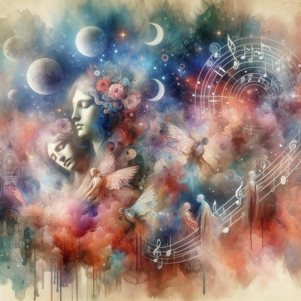 A serene figure plays a stringed instrument against a cosmic backdrop of swirling colors and musical notes, blending the ethereal beauty of music and the universe in a dreamlike scene.