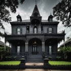 A grand, dark Victorian mansion features intricate architectural details, multiple spires, and elegant balconies. Lush greenery surrounds the imposing structure, creating a mysterious atmosphere.