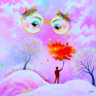 A whimsical Halloween scene features a grinning pumpkin wearing a striped witch's hat, surrounded by vibrant flowers and flying bats against a dreamy, pastel background.