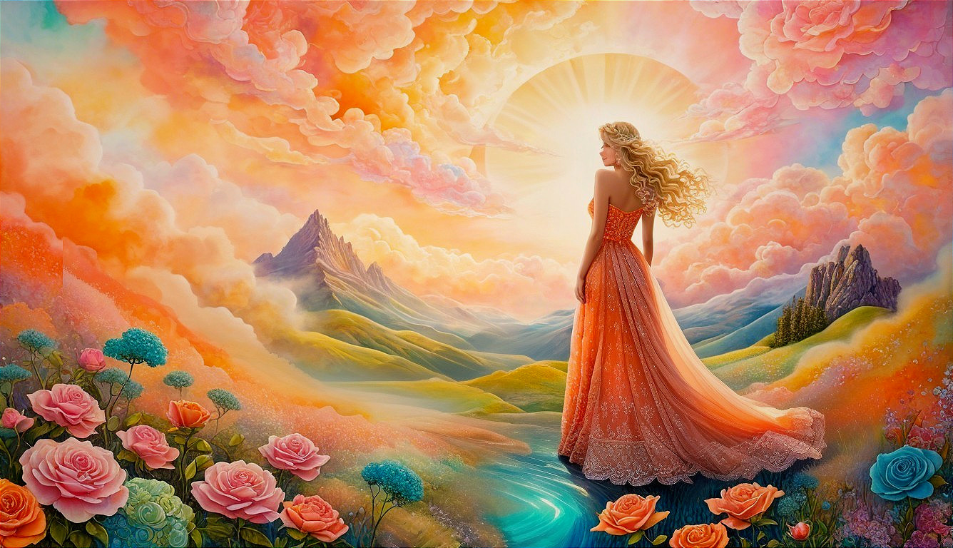 A figure in a flowing orange gown stands amid vibrant clouds and rolling hills, with colorful roses in the foreground and a radiant sun rising in the background, creating a dreamy atmosphere.