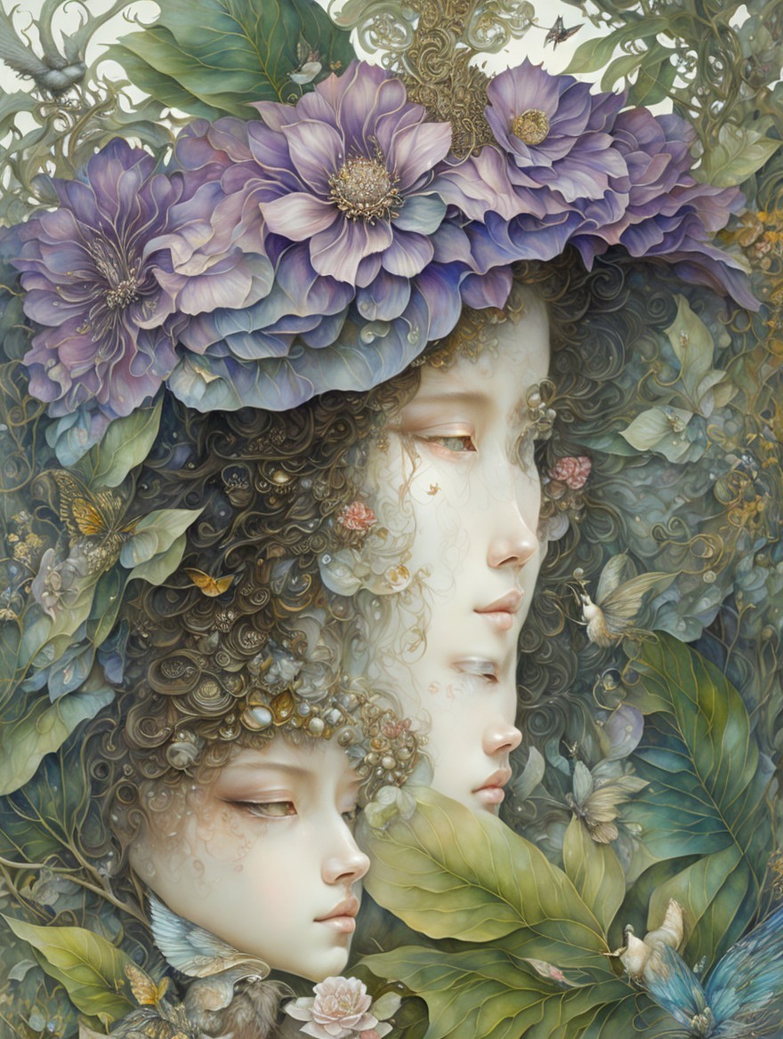 A woman with a blue hat adorned with flowers, red lips, and a bird on her hand, surrounded by leafy greenery.