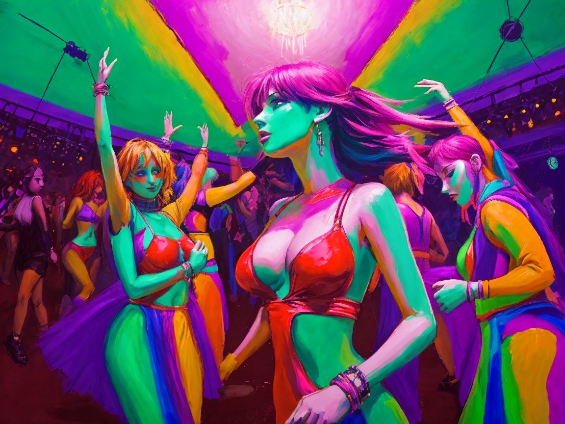 Prompt: "a painting of orgiastic dancing kinky humanoid manifestations of impulsive, escalating animalistic feelings in a darkroom underneath the spree, sweaty, drained but unable to stop in endless repetitive, sexually charged pulsating movements, trapped in the bass carpet of a night spent dancing in a club, in the meta-levels of Berlin that know no day"