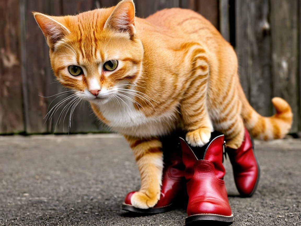 A charming orange tabby cat dressed as a valiant hero, complete with a feathered hat and stylish boots. It stands on a cobblestone path, exuding a playful yet noble demeanor.