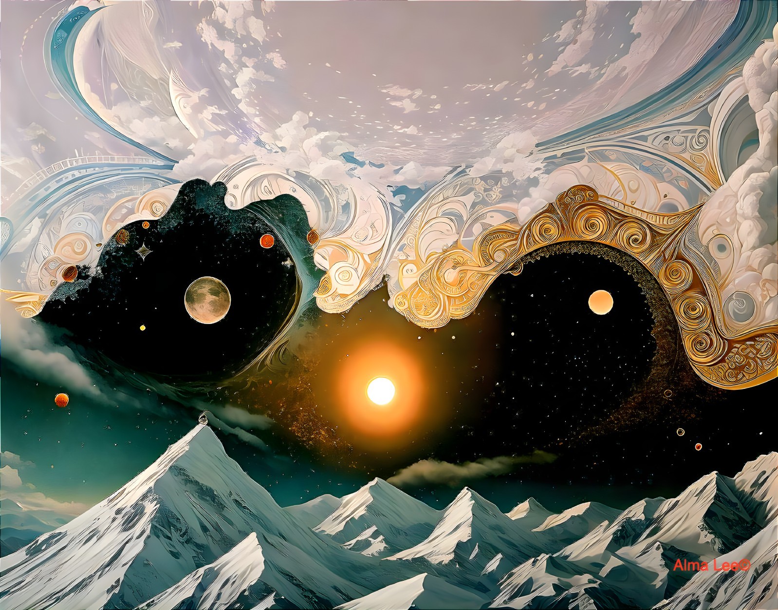 A surreal landscape with snow-capped mountains under a cosmic sky featuring swirling clouds, planetary bodies, and two distinct star systems.