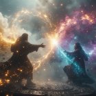 Two cloaked figures stand facing each other, casting swirling orbs of energy—one golden and fiery, the other blue and ethereal. They are surrounded by a mystical, cloud-filled landscape.