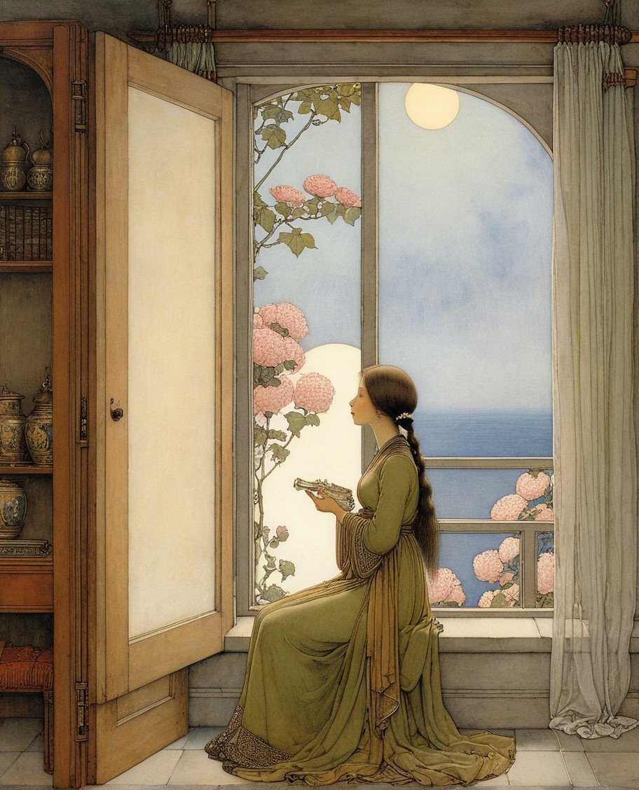 A serene woman in a flowing green robe sits by an ornate window, holding a book. Beyond her, a tranquil sea, distant mountains, and a sailing ship create a dreamy, picturesque landscape.