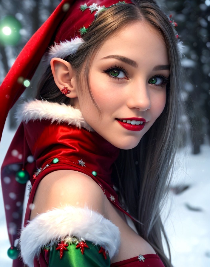Prompt: Sexy Cute Mischievous Christmas Elf Girl with long pointy elf ears, professional makeup, glossy wet ruby red lipstick, black eyeliner, shimmering eye shadow, and long thick black eyelashes