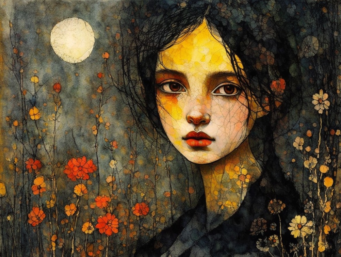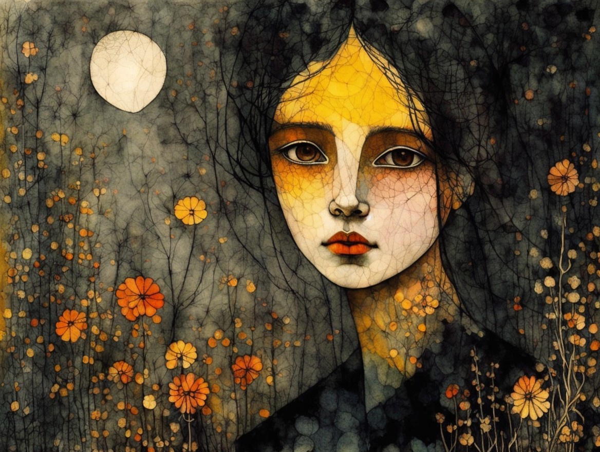 A stylized portrait of a girl with large eyes and a somber expression, set against a dark background. She is surrounded by abstract flowers and geometric shapes, evoking a sense of melancholy.
